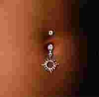 Przedmiotem aukcji jest kolczyk do pępka z białymi kryształkami oraz wiszącym słoneczkiem.