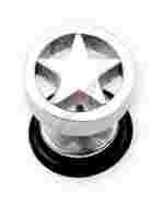 Przedmiotem aukcji jest kolczyk do ucha oszukany plug (fake plug) stalowy z odkręcanymi dyskami, jeden z dysków z logo 3d gwiazda