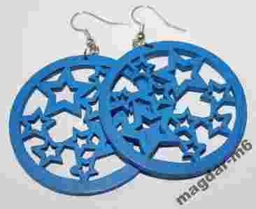 kolczyki drewno koła ażurowe niebieskie gwiazdki