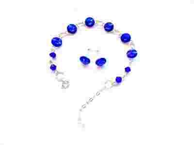 Z kryształkami Swarovski Rivoli o średnicy 6mm kolor Sapphire. Cały komplet jest wykonany ze srebra i kryształków. Kolczyki wkrętki z zatyczkami wykonane z najwyższej możliwej próby srebra 925. Elementy w bransolecie tj. talerzyki pod kryształki, kółka montażowe, zapięcie oraz łańcuszek są wykonane ze srebra 925. Maleńkie kryształki przy końcu bransoletki w kolorze szafirowym są akrylowe.
