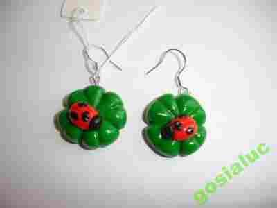 Kolczyki koniczynki z biedronką, bigle ze srebra