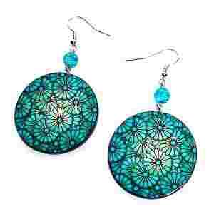 Śliczne, dwustronne kolczyki wykonane techniką decoupage. Bigle otwarte, antyalergiczne. Wymiary: średnica 3,5cm, długość 4cm Waga kolczyka 1,5g.