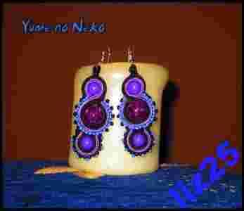 Całość zaimpregnowana z dwóch stron co chroni kolczyki przed zabrudzeniem i zmechaceniem się sznureczków w trakcie noszenia. Szklany crackle i akrylowe koraliki obszyte jedwabnymi sznureczkami w kolorach fioletowym i czarnym Kolczyki podklejone są filcem w kolorze czarnym. Wymiary: - długość całkowita 7 cm ( kolczyki 6 cm) - szerokość (w najszerszym miejscu) 2,5 cm