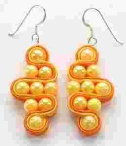 Piękne kolczyki w ciepłych kolorach: żółte koraliki połączone sznurkami sutasz w kolorach żółtym i pomarańczowym. Uszyte przezroczystą żyłką, z tyłu podklejone cieniutkim filcem w kolorze pomarańczowym. Zastosowane materiały są najwyższej jakości - bigle wykonane są ze srebra próby 925, a metalowa zawieszka do bigla zrobiona jest z posrebrzanego drutu.