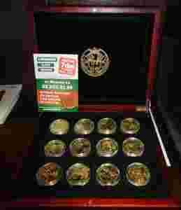 Kolekcja składa się z:monet wykonanych z mosiądzu, który platerowany jest 24 karatowym złotem(999/1000),średnica 38,61 mm,waga 24g,najwyższa jakość mennicza/stempel lustrzany/,rok emisji-2008.