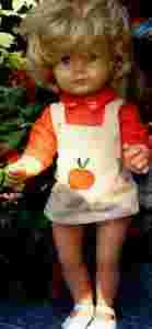 Naprawdę piękna lalka historycznej firmy Koenig & Wernicke (tu sygn. Wernicke), założonej w 1911 roku w Waltershausen w Turyngii. Lalka jest wykonana z celuloidu, ale głowę ma gumową. Włosy syntetyczne, mocowane w dziurkach. Lalka zamyka i wodzi bardzo wyrazistymi oczyma. Ma rozchylone usta, a w nich widoczne dwa białe ząbki. W plecach lalki umieszczony jest buczek, lalka płacze. Sama stoi. Strój dziewczyny jest oryginalny, kompletny: sukienka z jabłuszkiem, majtki, buty. Ze stroju można wnioskować, że lalka pochodzi z lat 60. XX wieku, ale dla wnikliwego kolekcjonera podpowiedzią będzie numerowanie 635/40. Ja nigdy nie byłam tak dociekliwa i nie poszukałam daty jej produkcji. Przypuszczam, że jest to początek światowej produkcji lalek o gumowych głowach, droga wówczas nowinka. Lalka wykonana jest bardzo starannie, widać, że nie jest to tania tandeta tamtych lat, ale markowy, wysmakowany produkt. Laleczka nie ma uszkodzeń. Polecam, jest to rarytas kolekcjonerski i przy okazji ładny przedmiot.