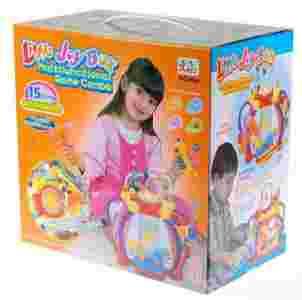 Płaszczyzna górna posiada: - włącznik/wyłącznik całego pudełka, - młotek z gumowanymi końcami oraz miejsce na jego przechowywanie, - świecąco-grający bęben, - dwa labirynty z kolorowymi koralikami do przesuwania.