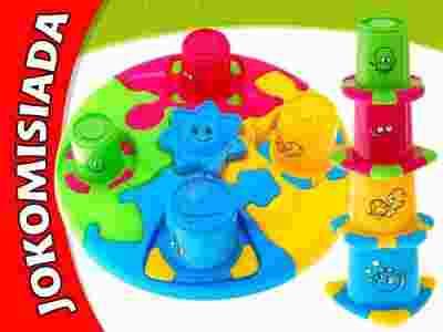 Bawić się można poprzez składanie zestawu, dopasowywanie poszczególnych elementów do siebie, układanie kolorowych kubków jeden na drugim.