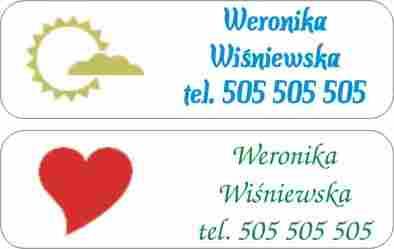 - Głównie umieszczamy na nim obrazek, imię i nazwisko oraz telefon kontaktowy. W doborze występujących na nim elementów istnieje pełna dowolność. Do dyspozycji mamy trzy linie tekstu. Treść nadruk możemy wykonać w jednym z kilku kolorów.