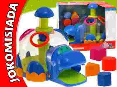 Zabawka przedstawia wesołego hipopotama, z kolorowymi klockami. Zabawa polega na dopasowywaniu kształtów kolorowych klocków do otworów, a następnie za pomocą ruchomego tłoku, poruszamy tarczą obrotową wewnątrz zabawki, gdzie klocki wyrzucane są przez paszcze hipcia. Zabawka uczy rozpoznawania kształtów, kolorów a przede wszystkim zapewnia wesołą zabawę.