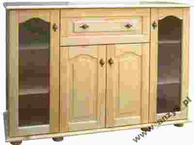 Duża komoda drewniana z dwoma przeszklonymi witrynami po zewnątrz za którymi znajduje się po dwie ruchome półki. W środkowej części pod blatem jest głęboka szuflada, poniżej szafka z dwoma drzwiczkami, a w środku półka z możliwością regulacji położenia.  Całość uzupełniają stylizowane uchwyty wybarwione w starym złocie, oraz nadające lekkości toczone stopki u podstawy.