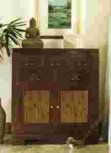 Mebel tekowy, elementy z pędów bambusa.