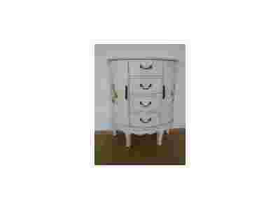 Przedmiotem aukcji jest komoda drewniana , ręcznie malowana , wyposażona w kilka szufladek oraz podwójne drzwiczki, okucia metalowe.