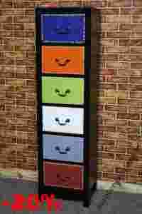 Komoda jest nowa, sprzedawana w II gatunku. Wykonana częściowo z drewna w połączeniu z płytą MDF. Posiada sześć kolorowych szuflad, celowo postarzałe fronty oraz delikatne otarcia na kantach. Drobne wady widoczne na zdjęciach.