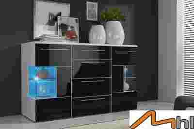 Nowoczesna duża komoda ROMA z frontami w wysokim wysokim połysku i oświetleniem LED.