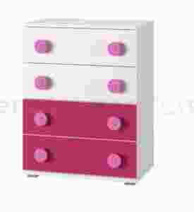Fronty i korpusy mebli wykonane zostały z odpornej na zarysowania, uszkodzenia, wilgoć i wysoką temperaturę, płyty laminowanej, co w pokojach dziecięcych ma szczególne znaczenie. Ozdobne wstawki we frontach wykończone są folią na wysoki połysk, możesz je wybrać w jednym z trzech bajecznych kolorów, niebieski, różowy lub zielony.