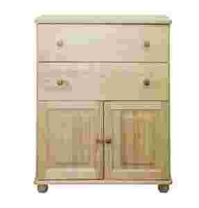 Komoda posiada 2 drzwi osadzonych na solidnych zawiasach puszkowych oraz 2 głębokie i pojemne szuflady. W środku znajduje się 1 półka (półka również jest z drewna) na ubrania.