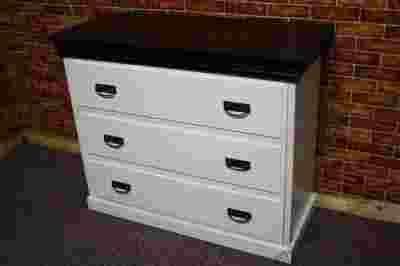 Komoda jest nowa, wykonana w całości z drewna (obicie tylne komody wykonane z płyty). Sprzedawana w II gatunku może posiadać małe wady w postaci niedociągnięć podczas malowania. Komoda składa się z jednej paczki do samodzielnego montażu, w której znajduje się instrukcja oraz komplet śrub. Komoda posiada trzy szuflady. Uchwyty oraz listwa ozdobna nadają komodzie dodatkowego uroku. Występuje w dwóch kolorach miodowym oraz biało-brązowym. Do komody w kolorze biało-brązowym dostępne lustro na inne aukcji. Wszystko widoczne na zdjęciach.