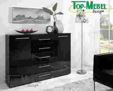 Nowoczesna KOMODA z frontami w wysokim połysku. Wykonana jest z wysokiej jakości płyty laminowanej. Korpus komody to czarna płyta laminowana. Fronty komody są wykonane z nowoczesnej płyty POLYGLOSS dającej nowoczesny i designerski wysoki połysk. Płyta POLYGLOSS obok niesamowitego efektu wizualnego daje dodatkowo niesłychaną odporność na zarysowania i co bardzo ważne wysoką odporność na wszelkiego rodzaju środki chemiczne.