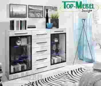 Nowoczesna KOMODA z frontami w wysokim połysku. Wykonana jest z wysokiej jakości płyty laminowanej. Korpus komody to płyta o śnieżnobiałym kolorze. Fronty komody są wykonane z nowoczesnej płyty POLYGLOSS dającej nowoczesny i designerski wysoki połysk. Płyta POLYGLOSS obok niesamowitego efektu wizualnego daje dodatkowo niesłychaną odporność na zarysowania i co bardzo ważne wysoką odporność na wszelkiego rodzaju środki chemiczne. Oświetlenie półek szklanych w kolorze niebieskim. Oświetlenie LED GRATIS !!!
