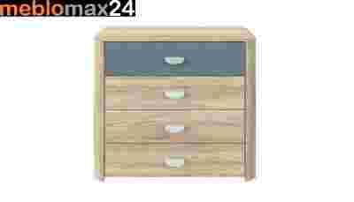 Jasna komoda z czterema szufladami do pokoju młodzieżowego dostępna w dekorze Dąb Sonoma. Mebel wykonany został w młodzieżowym stylu – górna szuflada w kolorze szary Antracyt stanowi oryginalny kontrast z całością. Charakterystycznym elementem ozdobnym są „ścięte” krawędzie korpusu oraz bezpieczne w użytkowaniu, muszelkowe uchwyty. Obrzeża komody zabezpieczono tworzywem ABS.