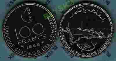 KOMORY /KM-18/ 100 FRANCS 1999 Łódź rybacka-Ryba