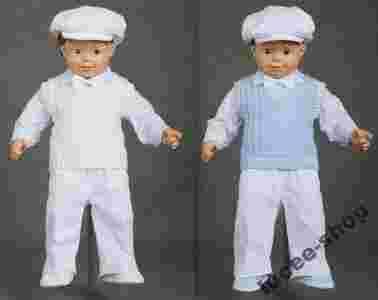 W skład kompletu wchodzi: dzianinowa kamizelka, sztruksowe spodenki , koszula, czapeczka typu kaszkiet oraz muszka.