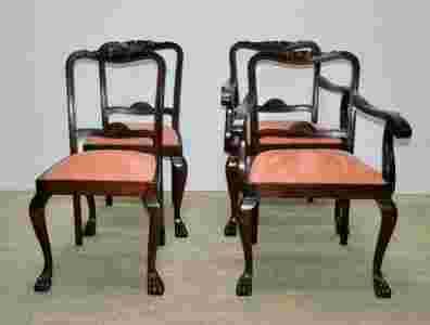 Zapraszam do zakupu kompletu krzeseł. Powstały one w latach 30 tych XX wieku i wykonane są z drewna dębowego. Komplet składa się z dwóch foteli i dwóch krzeseł. Zarówno jak krzesła jak i fotele maja przednie nogi zakończone łapami.