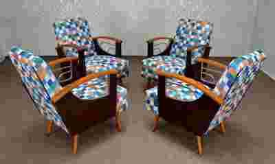 Fotele przeszły gruntowną, fachową renowację i są w idealnym stanie, zarówno technicznym, jak i wizualnym. Na uwagę zasługuje fakt, że odnowiona została tapicerka a siedziska i oparcia są na sprężynach, które bardzo dobrze wybijają. Fotele są sztywne, bardzo ciężkie i stabilne, nadają się do bezpośredniego ustawienia w domu.