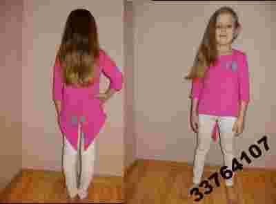 Bardzo wygodny, uszyty z elastycznego i milutkiego w dotyku materiału tzw. dresówki. Bluzeczka z przodu ma kokardkę , z tyłu rozcięcie wykończone piękną kokardką, co dodaje jej uroku. Rękawki 3/4.