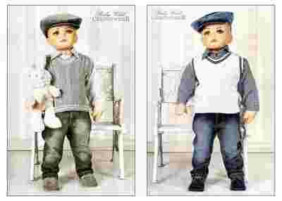Ubranko składa się ze sweterka, spodni, koszuli, muszki oraz czapeczki. Spodnie na gumeczkę z mankietami. Koszulka bawełniana z długim rękawkiem zapinana na guziczki. Czapeczka uszyta z tego samego materiału co spodenki.