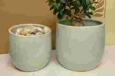 Komplet dwóch doniczek (osłonek) szkliwionych w kolorze niebiesko-szarym.