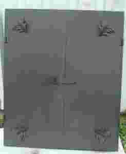 Drzwi paleniskowe wypełnione są blachą (2 mm), posiadają ozdobne elementy kute oraz rączkę wraz z zasuwką. Proponowany wymiar drzwiczek to: 25 cm wysokości i 25 cm szerokości. Ościeżnice drzwiczek wykonane są z metalu (kątownik 25 mm x 25 mm) wyposażone w wąsy montażowe oraz dziury montażowe fi 8 mm. Istnieje możliwość zmiany wymiarów drzwiczek jak również strony montażu zawiasów ( tak aby drzwiczki otwierały się w prawo lub lewo ).