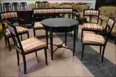 Wypoczynkowy komplet w stylu empirowym składający się z sofy, dwóch foteli, dwóch krzeseł oraz stołu. Stelaż w kolorze czarnym, zdobiony złotymi elementami z mosiądzu, tapicerka z kolorach pastelowych z kwiatowym motywem.