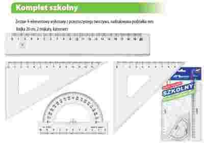 Zestaw 4-elementowy wykonany z przezroczystego tworzywa, nadrukowana podziałka mm. W skład zestawu wchodzą: linijka 20cm, 2 ekierki i kątomierz.