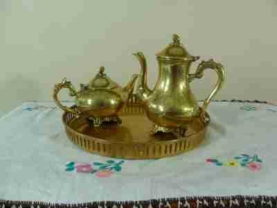 Mosiężny zestaw kawowo herbaciany. W skład kompletu wchodzi taca, czajnik,dzbanek.