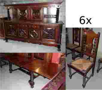 Niezwykły, finezyjnie rzeźbiony komplet jadalny w wyjątkowo atrakcyjnej cenie. Bardzo dobry stan mebli. Stół jest rozkładany. Kluczyki do kredensu w komplecie. Jedno z krzeseł ma widoczne na zdjęciu przetarcia na siedzisku.