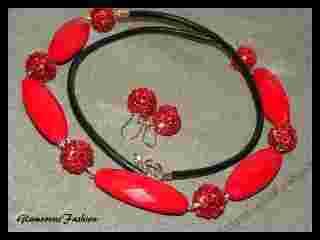NASZYJNIK I KOLCZYKI WYKONANE Z ANTYALERGICZNYCH ELEMENTÓW POSREBRZANYCH ,CZARNEGO RZEMIENIA ORAZ PIĘKNYCH AKRYLOWYCH KRYSZTAŁKÓW AL'A SWAROVSKI KOLOR CZERWONY