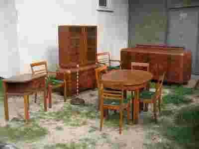 Mam do sprzedania komplet starych mebli w stylu art-deco w skład kompletu wchodzą: stół rozkładany,cztery krzesła ,dwa foteliki,stolik z dwiema szufladami i półką,witryna dwu częściowa górna część oszklona wewnątrz dwie szklane półki dolna część do zagospodarowania-półki szuflady , duża trzy drzwiowa komoda możliwość rozkręcenia w elementy(praktyczne podczas transportu) środek bardzo pakowny z dwiema półkami z podwyższeniem na blacie oraz lampa stojąca brak klosza.Meble w stanie używanym z mieszkania stan ogólny do renowacji żadnych śladów po korniku.Wymiary:komoda-szer:200cm, wys:95cm,gł:61cm,witryna-część dolna szer:120cm,wys:70cm,gł:45cm,część górna-wys:100cm, szer:110cm, gł:35cm, stół-wys:80cm,szer:90cm,dług:122cm,po rozłożeniu max-183cm na wyposażeniu dwa wkłady pomocnicze.Meble nie są zniszczone ale moim zdaniem wymagają renowacji !!!!!tel-669[zasłonięte]482.