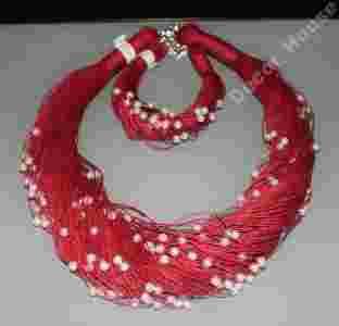 KOMPLET naszyjnik bransoletką CZERWONY LEN + PERŁA