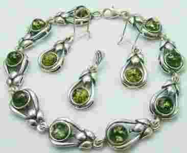 komplet srebrny srebro bursztyn zielony groszek