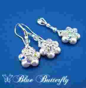 Komplet, na który składają się kolczyki i zawieszka wykonane ze srebra P 925 oraz kryształków i perełek Swarovski, długość kolczyków 4 cm, długość zawieszki 3,5 cm.