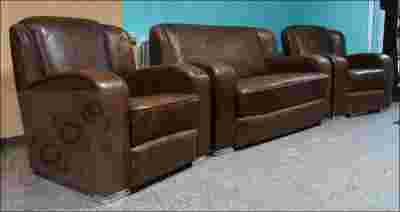 Skórzany komplet wypoczynkowy Art Deco: sofa i dwa fotele. piękne kształty charakterystyczne dla stylu, wygodne, głębokie siedziska.