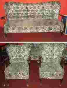 Kanapa i fotele bardzo wygodne, na sprężynach. Kanapa wymaga drobnej naprawy (przymocować jeden podłokietnik), po wymianie tapicerki otrzymamy przepiękny stylowy zestaw wypoczynkowy, który stanie się niezwykłą ozdobą każdego salonu.