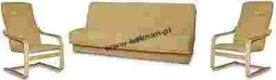 Nowoczesny komplet wypoczynkowy. W zestawie wersalka i dwa fotele finka na drewnianych płozach.