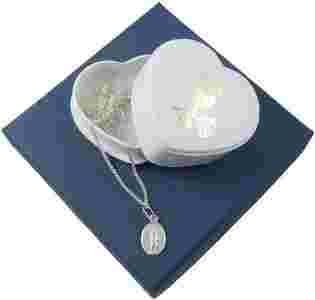 Wysokiej jakości wykonania zestaw komunijny idealny na Pierwszą Komunię Świętą: tradycyjny Cudowny Medalik Niepokalanej na łańcuszku, całość wykonana ze srebra próby 925.