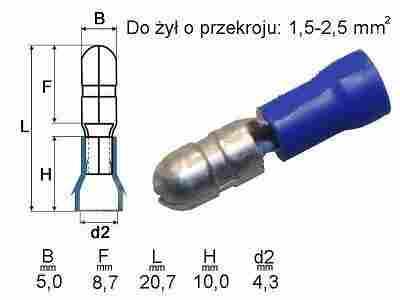 - Materiał: mosiądz, cynowany - Izolacja: PVC - Zakres temperatur pracy: -55°C-105°C - Żyła [mm²]: 1,5-2,5 - Kolor: niebieski - Średnica wtyku [mm]: 5,0