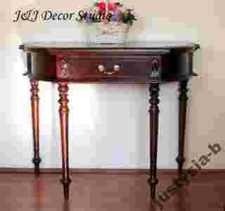 J&J Decor Studio zaprasza na aukcje! Przedmiotem aukcji jest elegancka konsola- stolik z niezwykłymi zdobieniami wykonana w całości z litego drzewa mahoniowego w kolorze ciemnobrązowym (ciemny kasztan delikatnie przechodzący w mahoń). Konsola jest bardzo solidnie i precyzyjnie wykonana. Główny jej atut to piękne, ręcznie wykonane zdobienia. Konsola jest nowa.