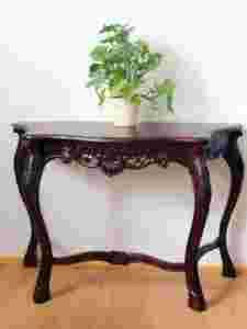 J&J Decor Studio zaprasza na aukcji! Przedmiotem aukcji jest elegancka konsola- stolik z niezwykłymi zdobieniami wykonana w całości z litego drzewa mahoniowego w kolorze ciemnobrązowym (ciemny kasztan delikatnie przechodzący w mahoń). Konsola jest bardzo solidnie i precyzyjnie wykonana. Główny jej atut to piękne, ręcznie wykonane zdobienia. Konsola jest nowa.