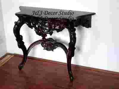 J&J Decor Studio zaprasza na aukcji! Przedmiotem aukcji jest elegancka konsola- stolik z niezwykłymi zdobieniami wykonana w całości z litego drzewa mahoniowego w kolorze ciemnobrązowym (ciemny kasztan delikatnie przechodzący w mahoń). Konsola jest bardzo solidnie i precyzyjnie wykonana. Główny jej atut to piękne, ręcznie wykonane zdobienia. Konsola jest nowa.